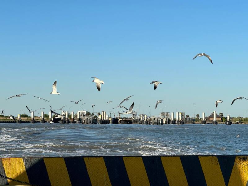 Lots of seagulls accompanied us on the free ferry to Galveston. A holiday mood sets in.